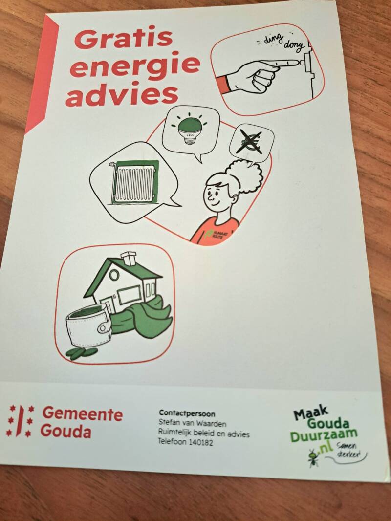 Deze week belde een adviseur van Klimaatroute bij mij aan. Ik had een week tevoren al een folder van de gemeente ontvangen met de mededeling dat ik hen aan mijn deur kon verwachten. De adviseurs, die werken voor de gemeente Gouda, geven tips en advies over mogelijke kostenbesparingen op energie en kijken samen met je waar jij in jouw huis nog (meer) kunt besparen.